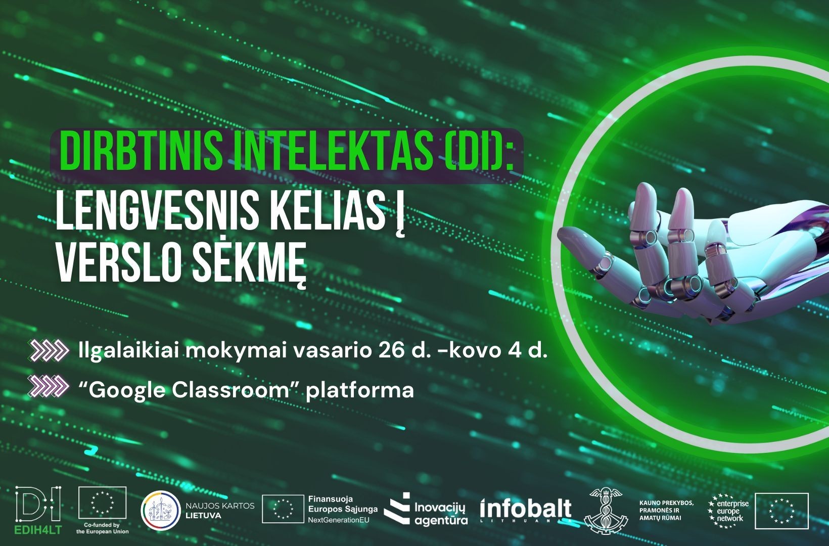 The Lithuanian Association of Digital Technologies INFOBALT, invites you to take part in a one-week distance learning course “Artificial Intelligence: an easier path to business success” for small and medium-sized enterprises in Central and Western Lithuania.